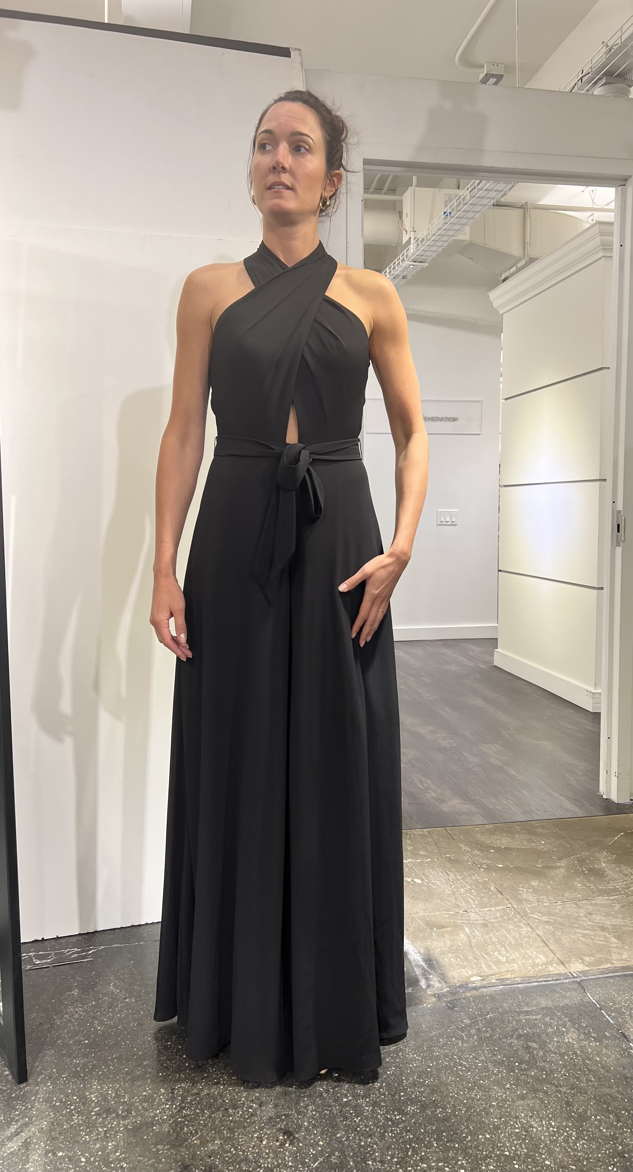 Beautiful halter jumpsuit with wide trumpet leg opening.